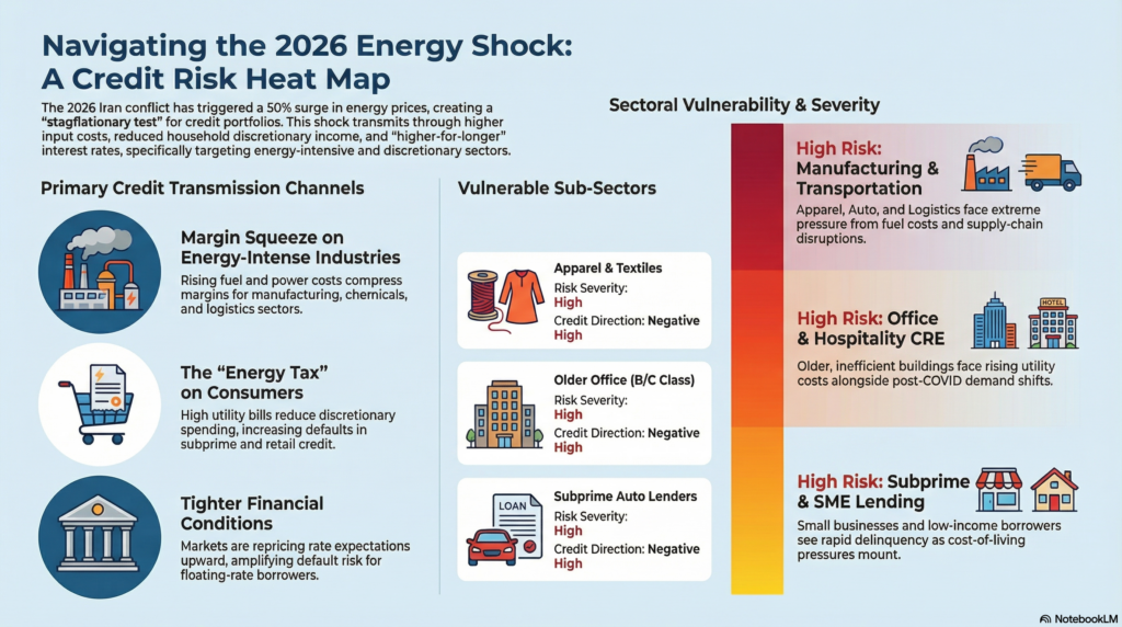 • Household real‑income shock: Higher energy and food bills function as an “energy tax,” reducing discretionary spending and raising delinquencies in unsecured consumer credit, subprime auto, and small business segments.