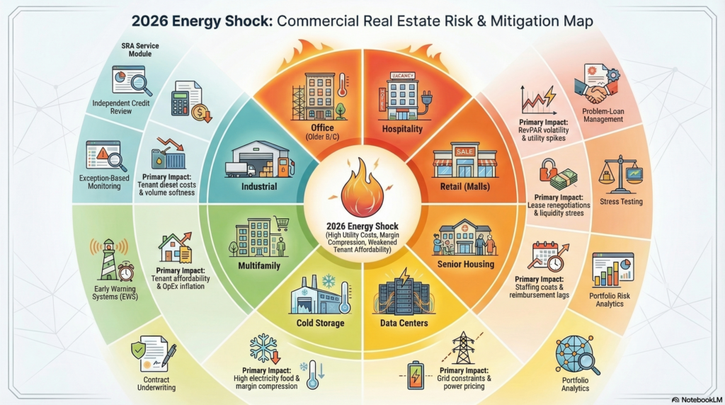 Multifamily and grocery‑anchored retail remain comparatively defensive, but face affordability constraints as tenants absorb higher rents on top of energy and food inflation, while small‑tenant retail and restaurant‑anchored strips are vulnerable to independent operator stress. For banks, the immediate priorities include updating DSCR and valuation assumptions for energy‑intensive property types, reviewing near‑term maturity walls, and linking tenant‑level early warning signals to property‑level risk grading.