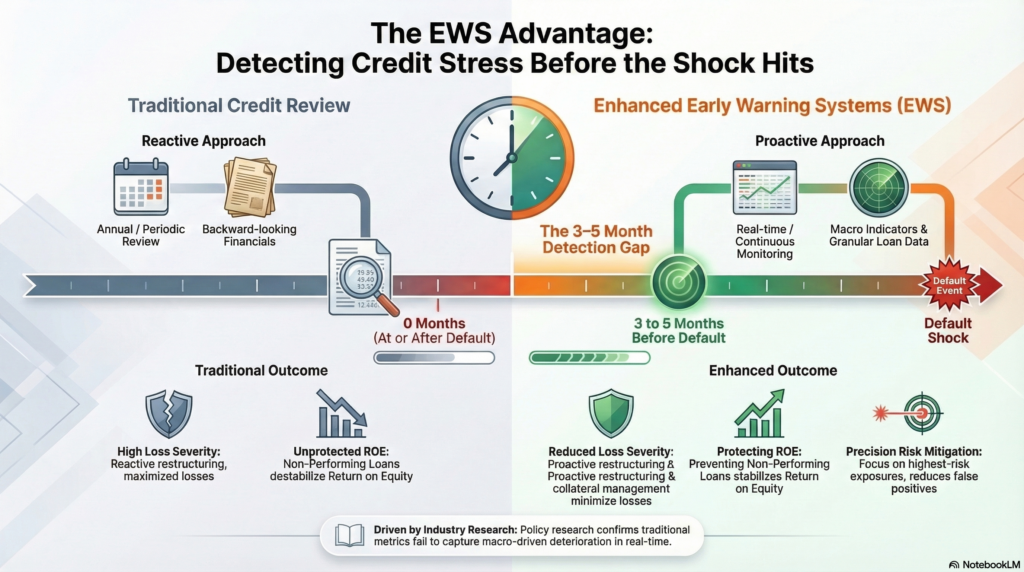 Academic and policy research on early‑warning indicators emphasizes that macro‑driven credit deterioration often arrives faster than traditional annual review cycles and rating processes can capture, especially when relying heavily on backward‑looking financials. Studies of NPL dynamics under macro shocks indicate that default rates can rise materially several quarters after the initial shock, with system‑wide effects depending on how quickly banks adjust underwriting, monitoring, and capital buffers.