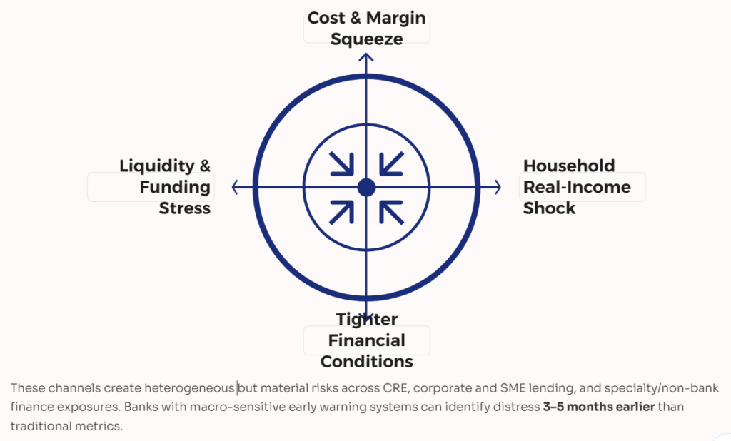 Energy shocks rarely impact credit directly—they transmit through margins, liquidity, and ultimately borrower behavior. The primary transmission channels include: