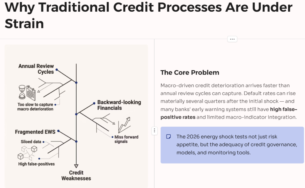 At the same time, industry studies highlight challenges with early warning frameworks: many banks’ EWS still have high false‑positive rates, limited integration of macro indicators, and fragmented data infrastructure, reducing their usefulness in fast‑moving environments. The 2026 energy shock thus tests not just risk appetite but also the adequacy of credit governance, models, and monitoring tools.
